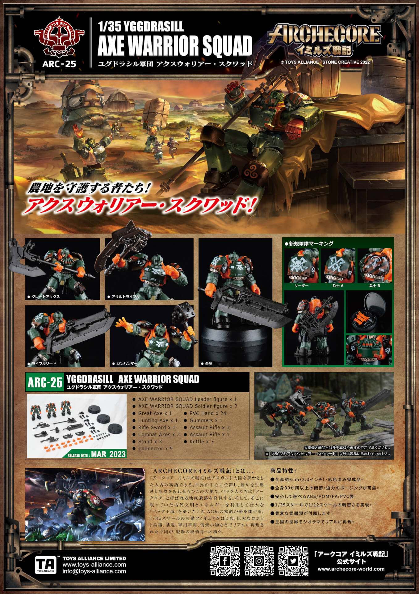 In order to strengthen their allies, the Kingdom of Veck transported a branch of their holy tree “Yggdrasill” into the oasis at the Principality of Omar to ensure that water springs eternal; as such, the squad responsible for this mission also took the name of the world tree. Aside from assisting the Principality of Omar to fend off the plundering of the sand lizards from Burning Sands, Yggdrasill Squad also carried the responsibility of field system of “unification of military and agriculture” to the Principality of Omar; the mission included expanding their harvest while safeguarding farming villages. The Axe Warrior Squad led this mission and taught troops from the Crimson Fox how to effectively fend off the guerilla tactics of the sand lizards to form the solid foundation of a military alliance.