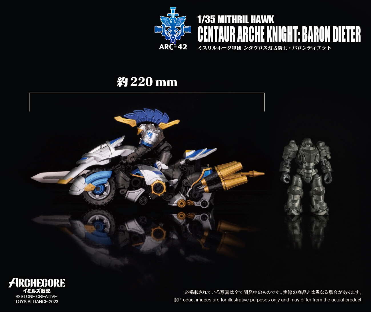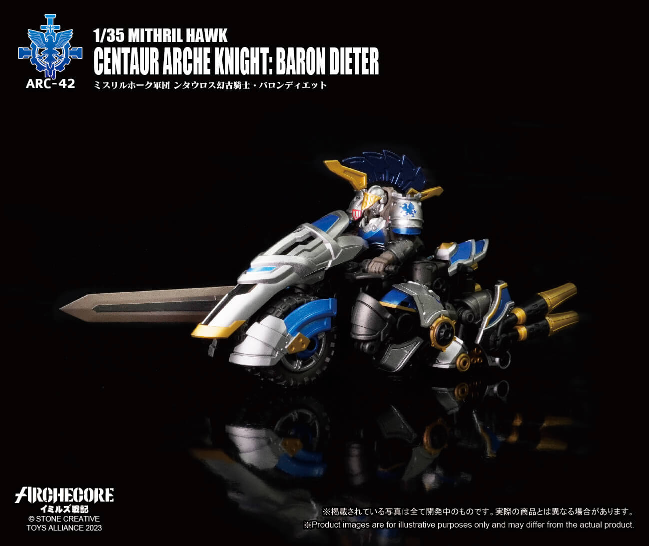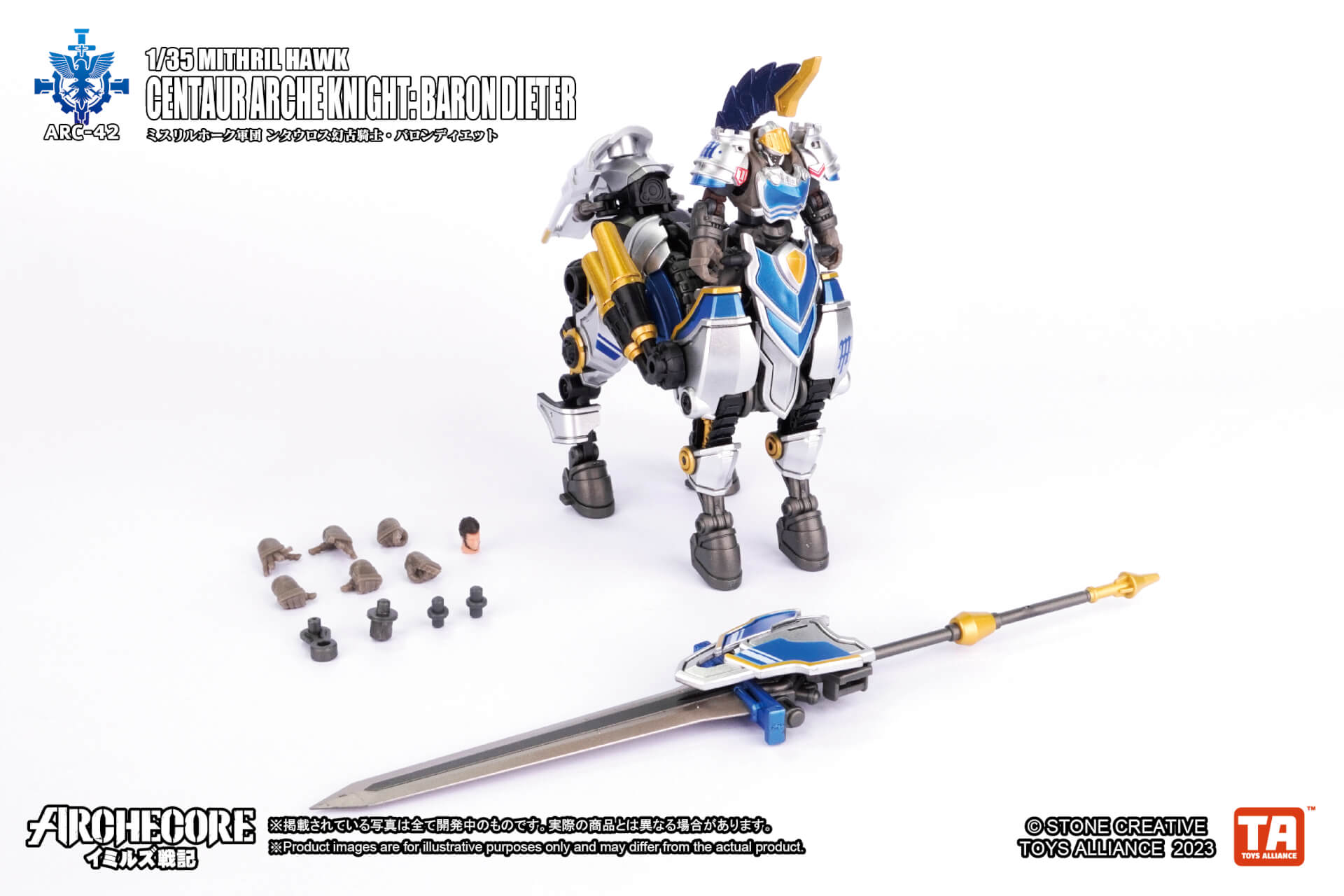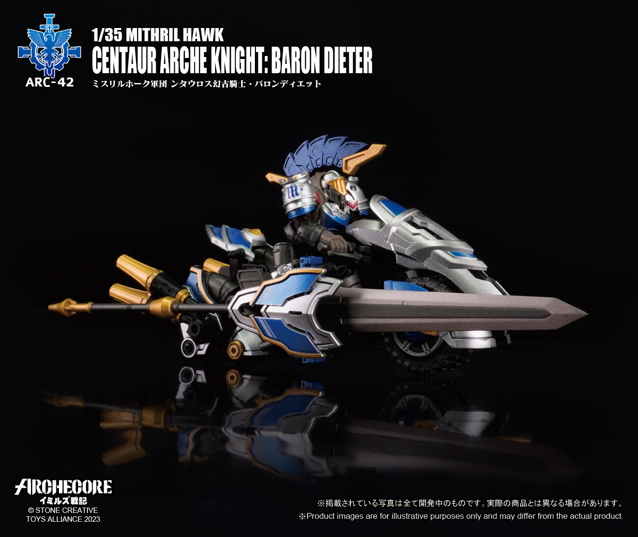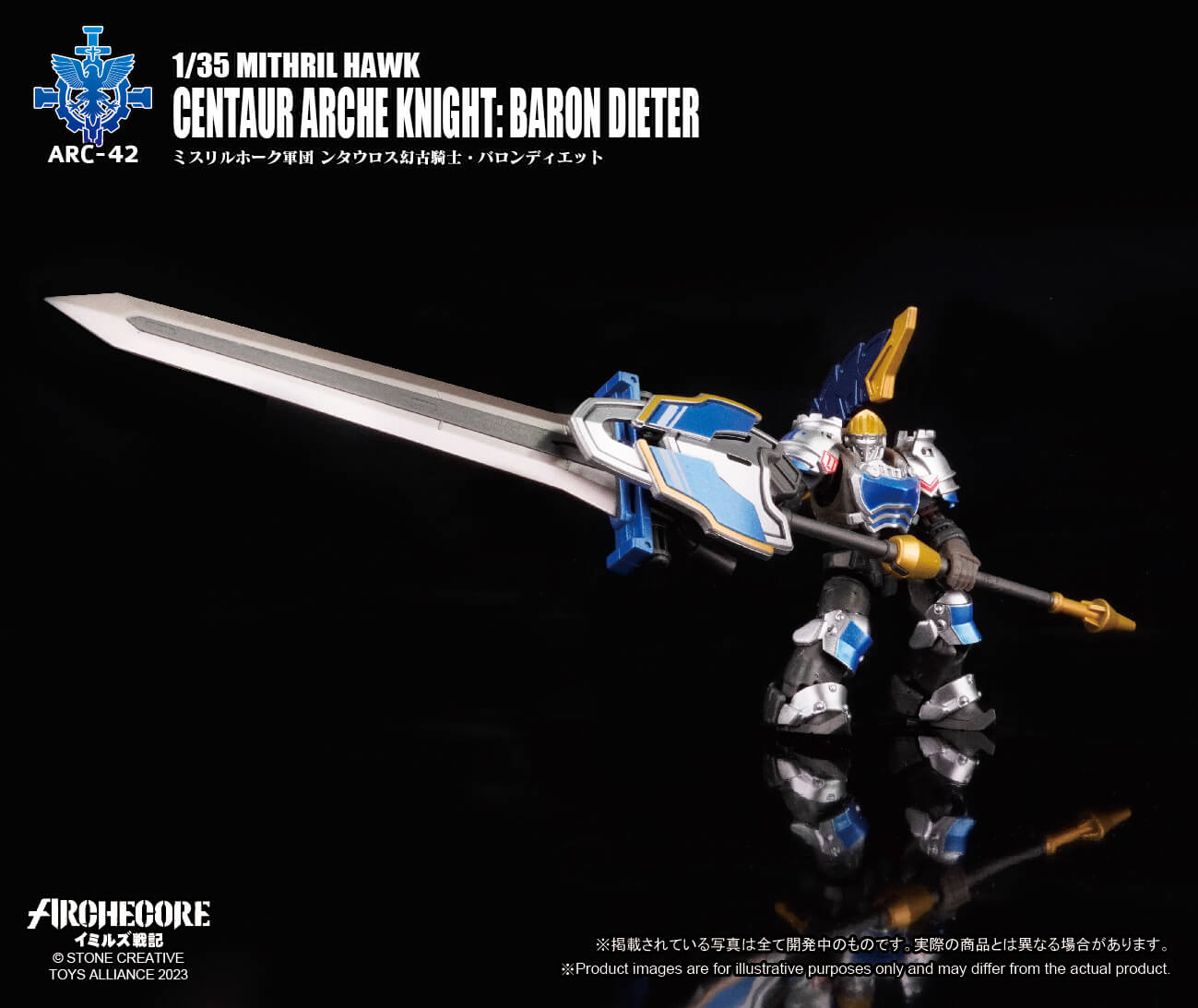 Thus, the Karstenite consul ordered Arche armorers to develop an Arche-based version of a knight’s equipment. The result was a suit of centaur-shaped armor, which was distributed to high-ranking knights in command positions. This particular suit of Centaur Knight armor belongs to Dieter von Feuerbach, Grand Master of the knights, appointed by the consul as second-in-command under Judge Narcissus von Herbst. His true mission: reining in the crafty judge.