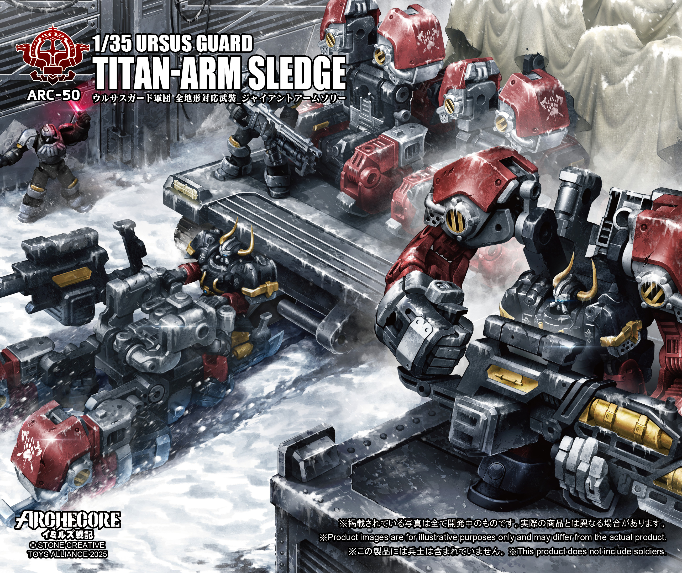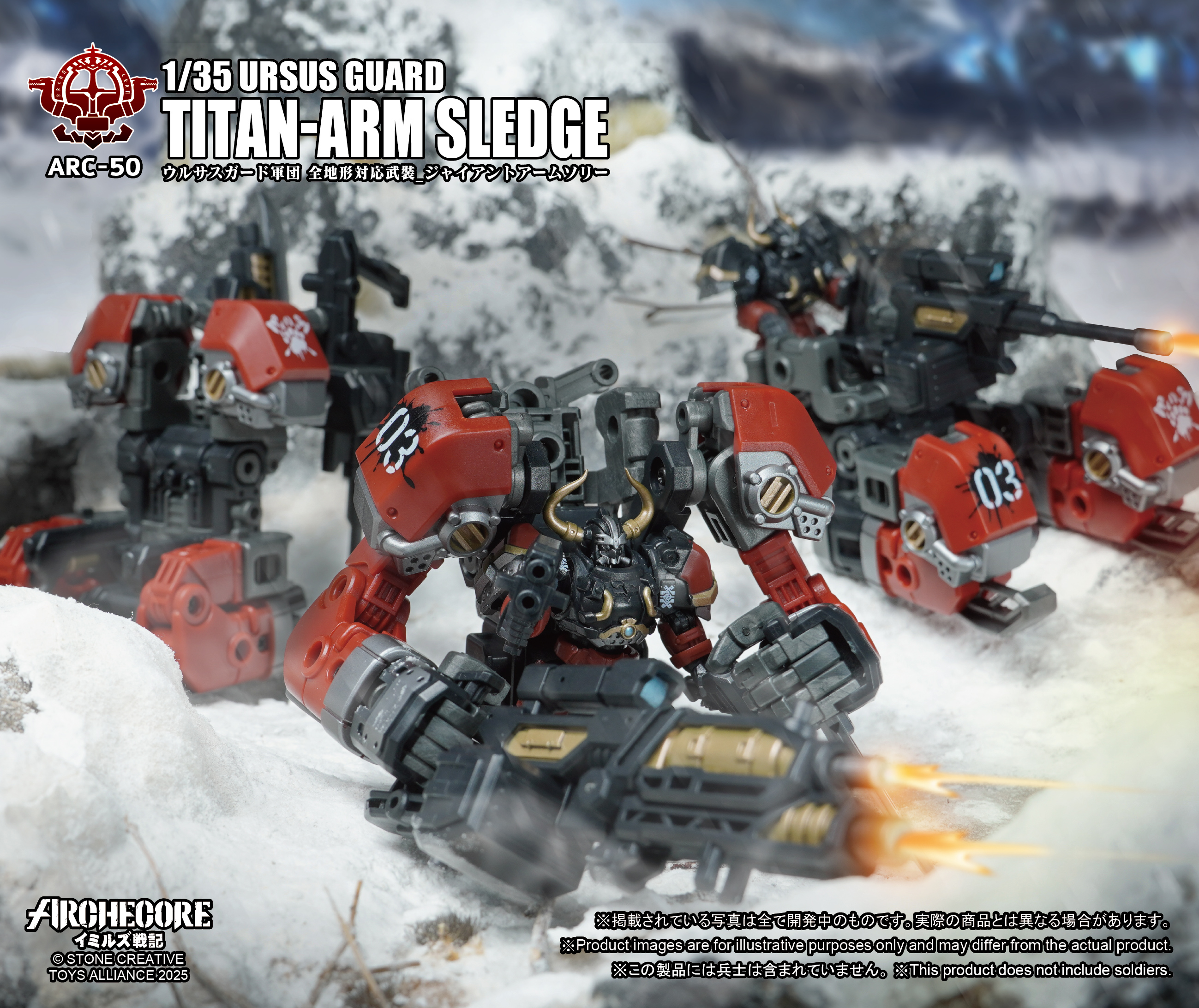 アスガルド大陸には有名な豪雪地帯がいくつかある。一年中氷に覆われる山にあるエルモ市にはじめ、標高の高いアンジュ山も雪に覆われている。護衛隊のジャイアントアームソリーは三連幻古モーターを装備してあるので、荷物を運んで山を越えることができる。内蔵フレームで簡単にソリから車両へ変形できる。中央にあるコンパートメントには1人しか乗れないが、必要に応じて肩に乗せるという形で増員も可能だ。孤立されて敵と接触した場合でも、藍スチールのアームで作戦できる。