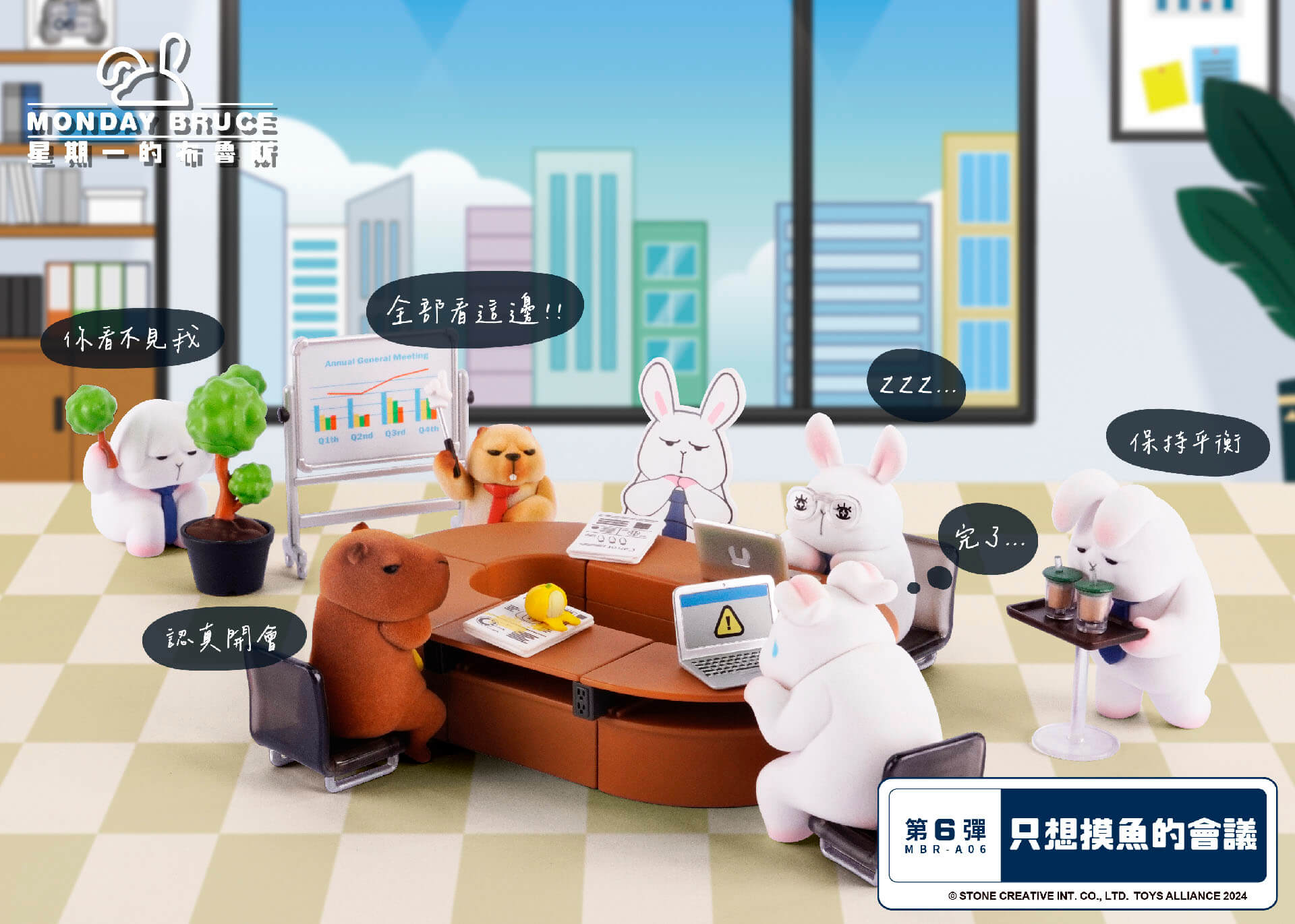 今天是月底,布魯斯討厭月底的結算發表日,今天土撥鼠主管海特好兇喔… 不知道能不能躲起來不要開會,對了,上次展覽好像有做個立牌… 想看看布魯斯在開會時想到的妙招嗎?千萬不要錯過這一套會議室的日常!!